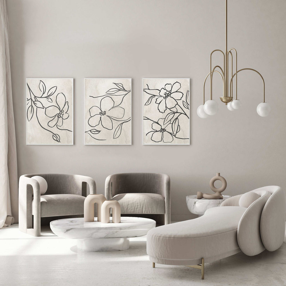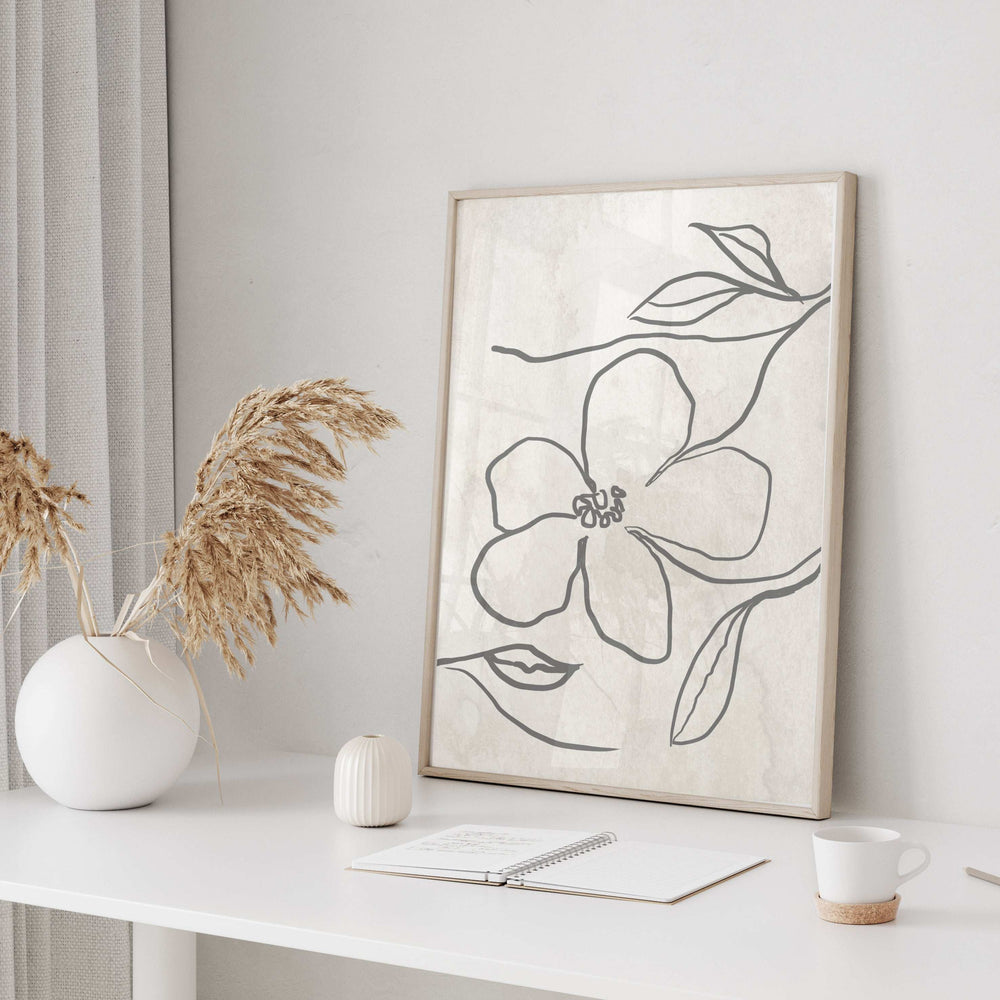 Blossom Hand Sketch 02 is an exquisite continuation of a journey through nature's delicate intricacies, rendering the poetic dance of blossoms in striking black line drawing. Set against a serene neutral backdrop, the artwork unfurls a new chapter of the floral tale, with blossoms stretching outwards in an elegant display of petals, stems, and leaves. This monochromatic rendition, while minimalistic, beautifully conveys the complex beauty of nature's creations.