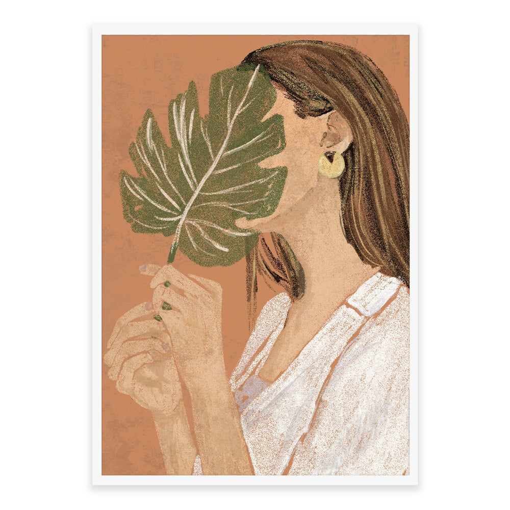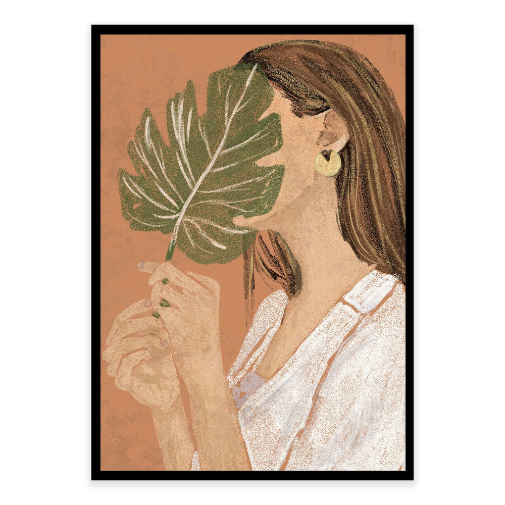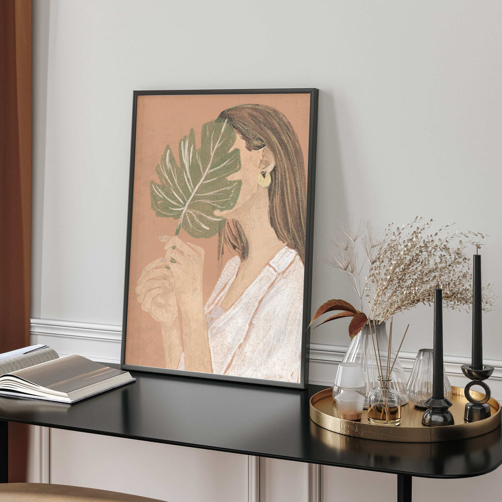 Maya Portrait Wall Art is a mesmerising blend of mystique and natural allure, bringing to life a moment that's both introspective and striking. The central figure, Maya, epitomises grace and elegance. Clad in a pristine white ensemble, she exudes an ethereal charm, further amplified by her unique pose – her visage gracefully concealed behind a lush tropical leaf.