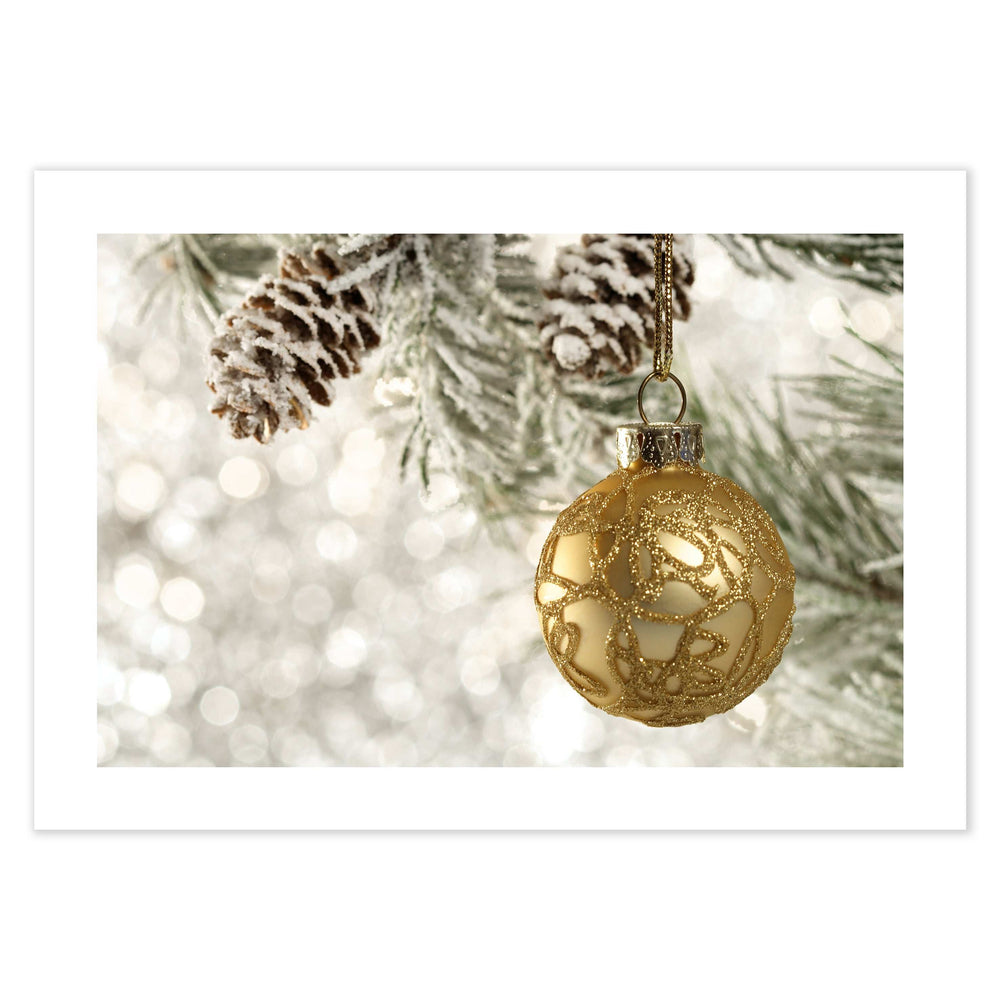 At the heart of this artwork is a mesmerising golden holiday bauble, delicately suspended from a tree branch. Its intricate design and lustrous sheen capture the very spirit of holiday celebrations, symbolising warmth, joy, and festivity. Surrounding this central motif, a soft-focus background gently unfolds, showcasing snow-kissed details that bring depth and dimension to the scene. The contrast between the luxurious bauble and the tranquil snowscape evokes a sense of peaceful festivity.