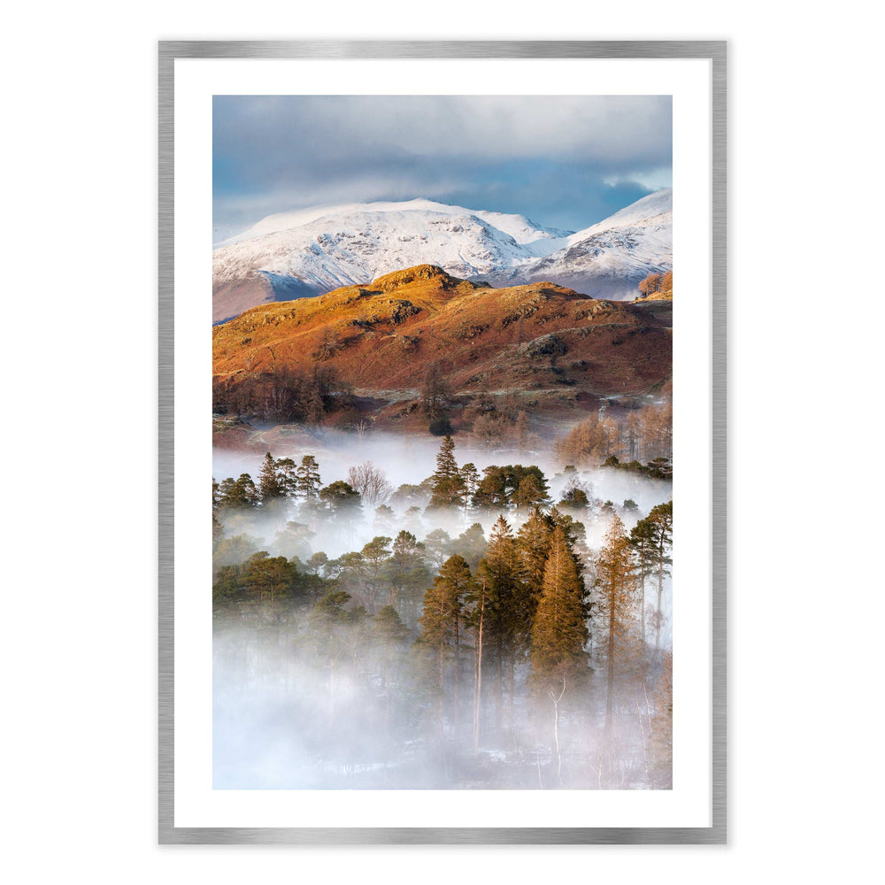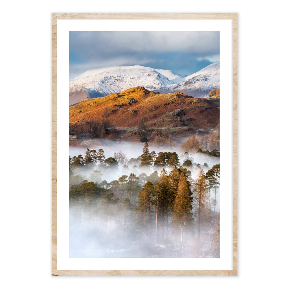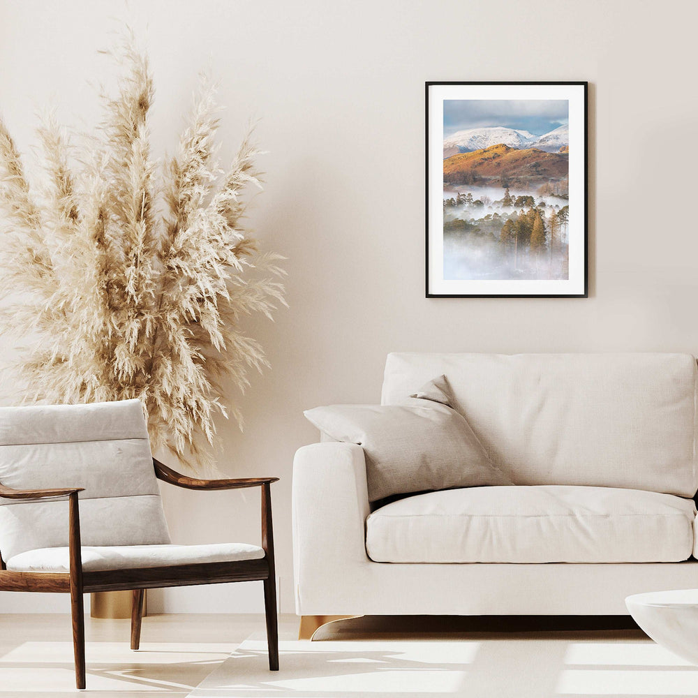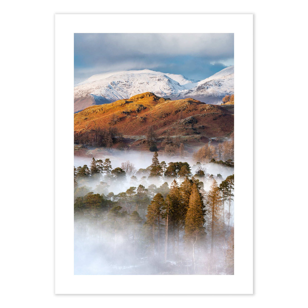 The subtle gradation of colours‚Äö from the misty greens of the treetops to the crisp whites of the snowy mountains, all set against a soft sky‚Äö creates a soothing palette that promises to bring calm and tranquility to any space it adorns.