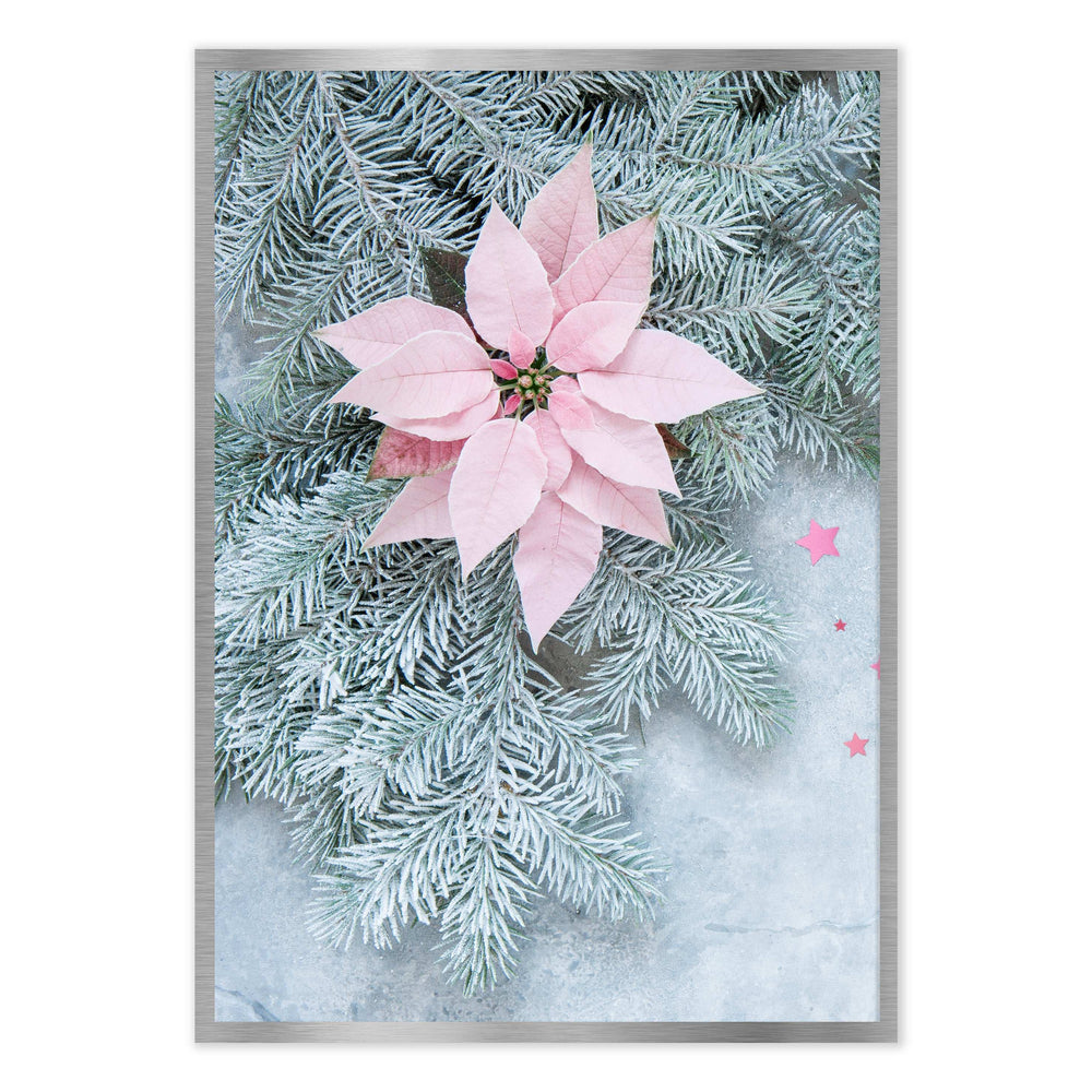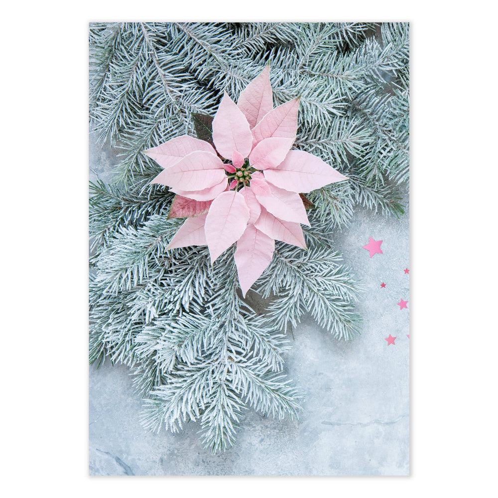 Journey into a serene winter moment with this exquisite portrayal of nature's festive offerings. Set against the cool and rustic charm of a stone background, soft green frosty fir needles intermingle with a delicately captured pink poinsettia flower. The gentle contrast between the vivid pink petals and the muted tones of the background creates a visual dance, encapsulating the quiet beauty of the winter season.