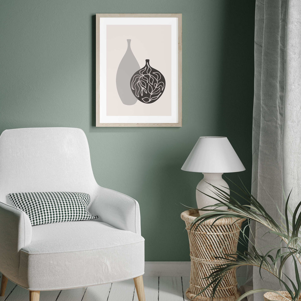 The composition exudes a harmonious balance. While the grey vase stands as a testament to minimalistic beauty, the adorned black vase adds depth and intrigue, pulling the viewer's gaze with its detailed leaf patterns. Together, they conjure an ambiance of modernity blended with a touch of nature's charm.