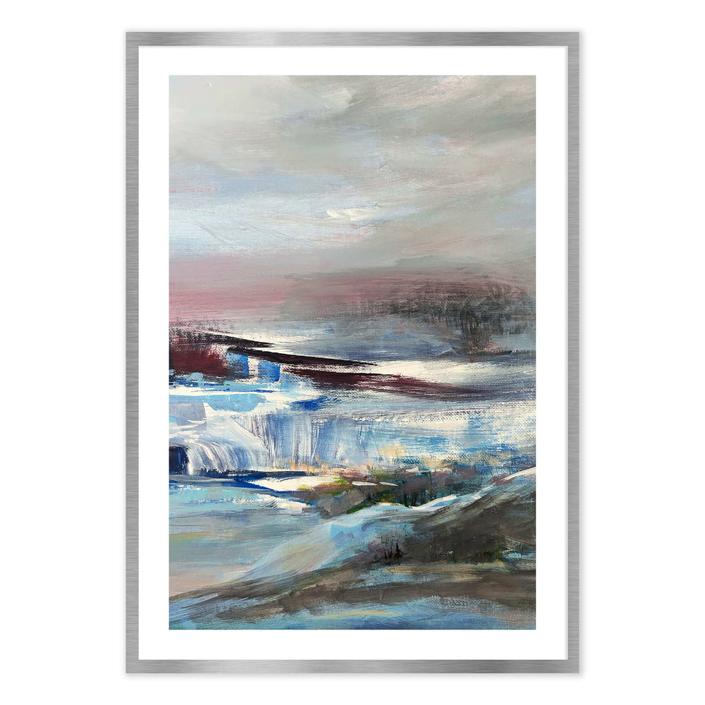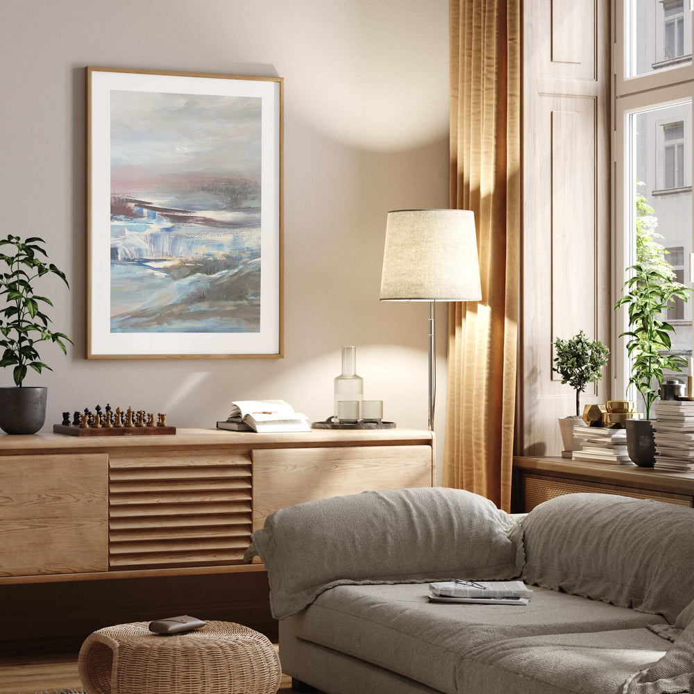 Dive into the captivating depths of "Painted Seas Abstract," a wall art piece that seamlessly marries the raw power of nature with an artist's dreamy interpretation. Crafted with a masterful touch, this artwork encapsulates the tumultuous beauty of waves crashing against steadfast cliffs, all under the ethereal glow of a pink-toned sky.