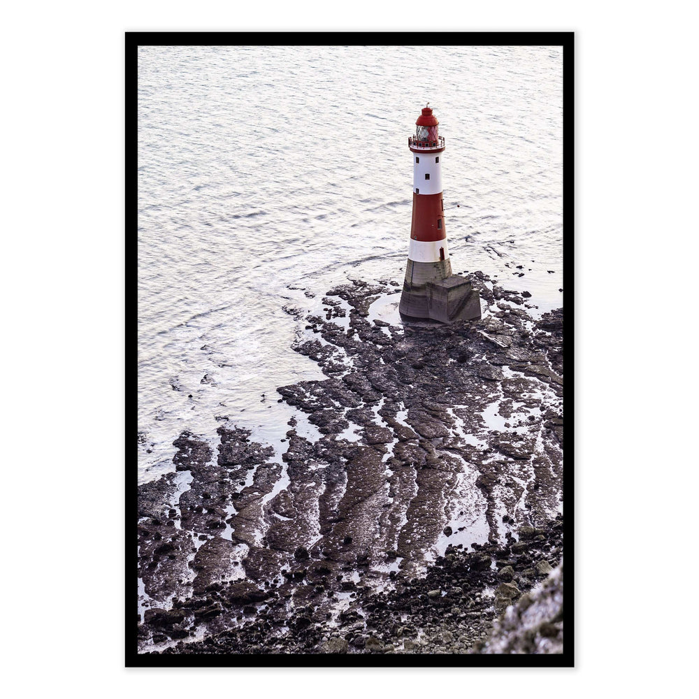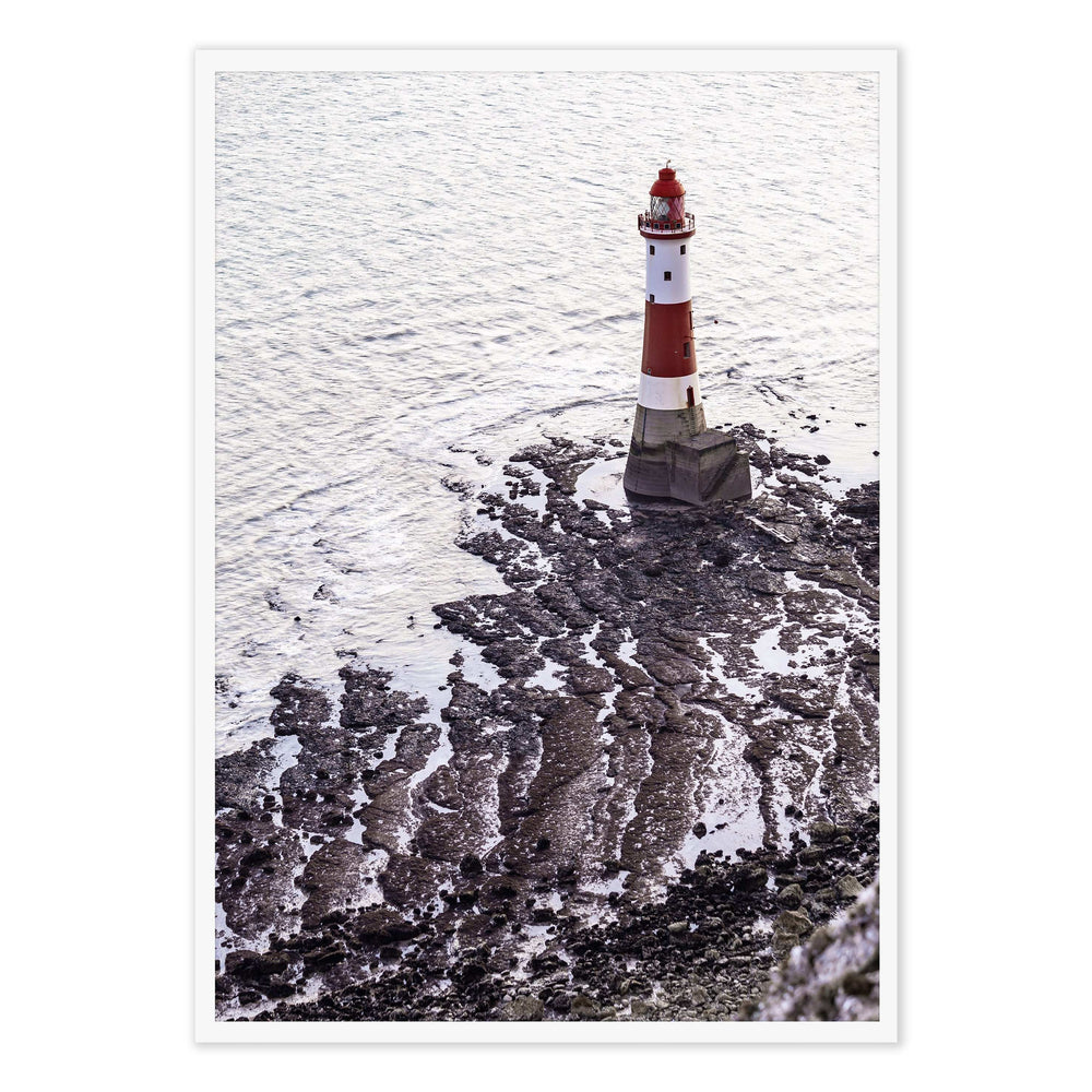 Navigate the realms of solitude and timelessness with the Red Lighthouse Photographic Print. This captivating photograph invites viewers to experience the steadfast presence of a striking red and white lighthouse, standing resolute against the backdrop of a vast, receding tide.