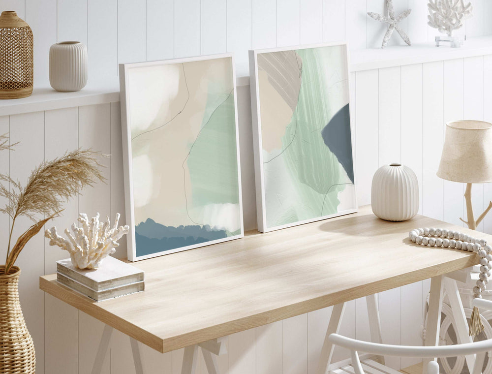 Add freshness and light to your interior with this abstract painted wall art. The layered blues, aquas and off-whites create an abstract coastal feel, bringing the ocean to you. Make a statement by pairing this print with Aqua Abstract 01.
